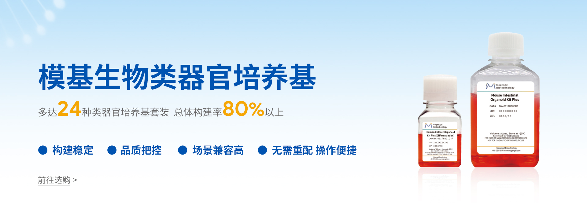 廈門模基生物科技有限公司致力于3D細(xì)胞培養(yǎng)核心原材料的研發(fā)與產(chǎn)業(yè)化升級(jí),是國(guó)內(nèi)一家從科研做起,從實(shí)驗(yàn)研究中一路走來(lái)的全流程自主研發(fā)、自主生產(chǎn)的企業(yè)。目前公司的產(chǎn)品有基質(zhì)膠、類器官培養(yǎng)基、細(xì)胞因子、3D細(xì)胞培養(yǎng)耗材、3D細(xì)胞培養(yǎng)智能顯微鏡等。公司擁有4大技術(shù)研發(fā)中心:分子克隆和細(xì)胞編輯中心、實(shí)驗(yàn)動(dòng)物中心、蛋白表達(dá)和純化平臺(tái)、類器官質(zhì)檢系統(tǒng)和自動(dòng)化。